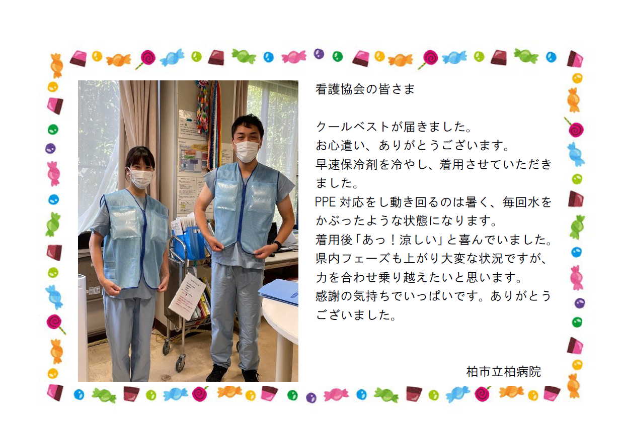 ・クールベストを着用することで、長時間のケアや処置でも暑さが緩和されます。本当にありがとうございました。まだまだ先が見えませんが、安全に患者さんを守っていきます。